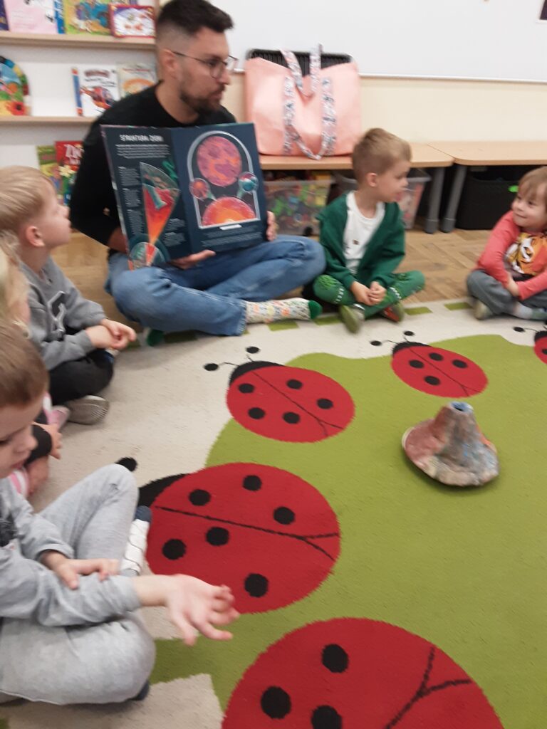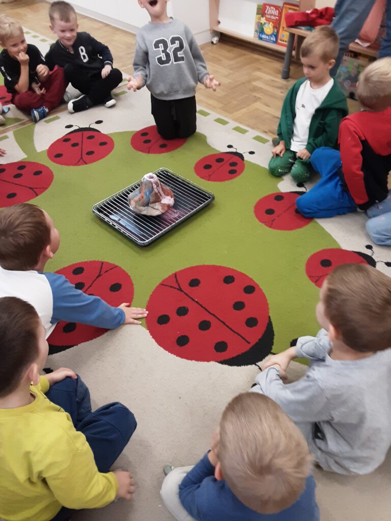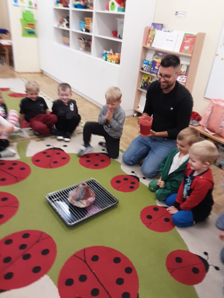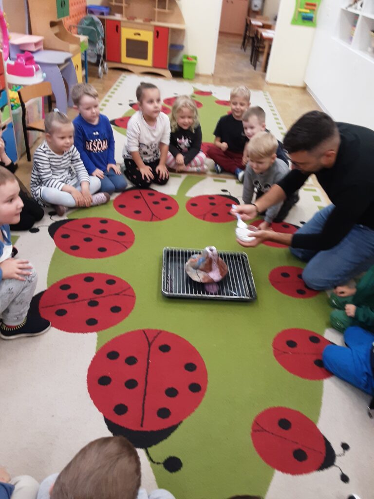 W czwartek 9 października odwiedził Naszą grupę tata naszego kolegi – Tadzia. Zaprezentował nam doświadczenie-pokazał jak wybucha wulkan. Zabawy było co niemiara.
