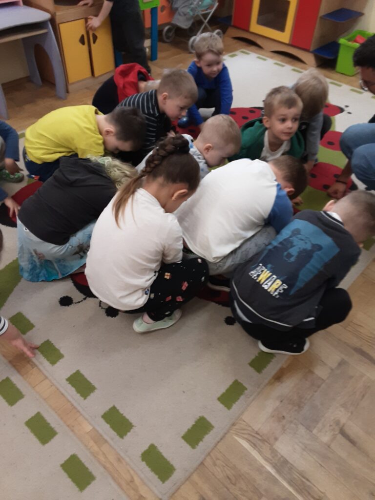 - utrwalanie znajomości pojęć matematycznych dotyczących orientacji przestrzennej, kształtowanie umiejętności określania położenia przedmiotów względem innych, wspieranie w dobrym funkcjonowaniu w grupie
