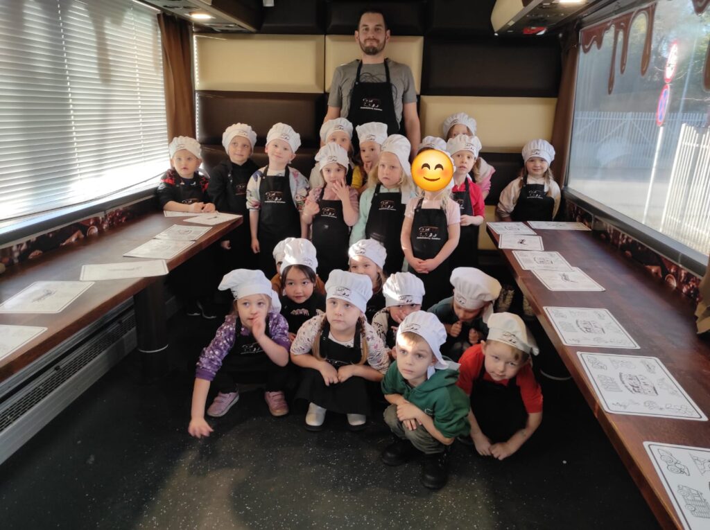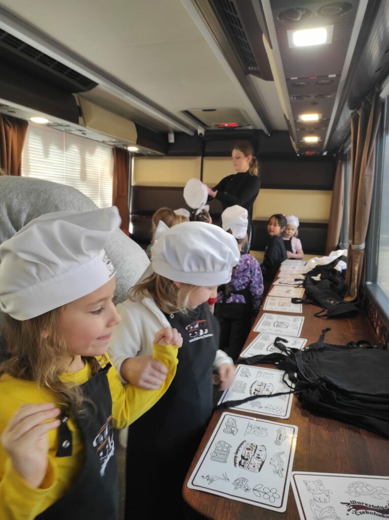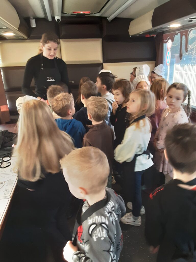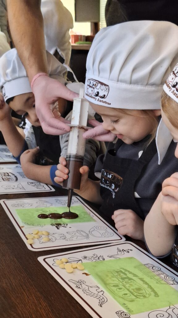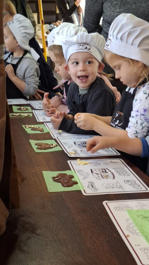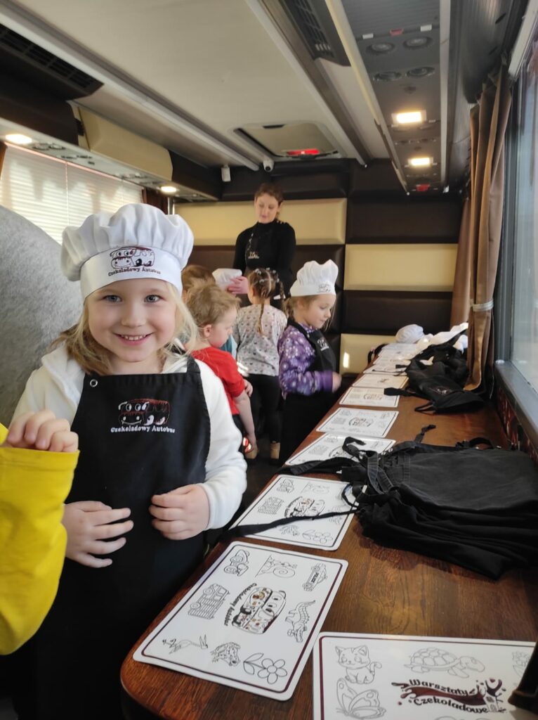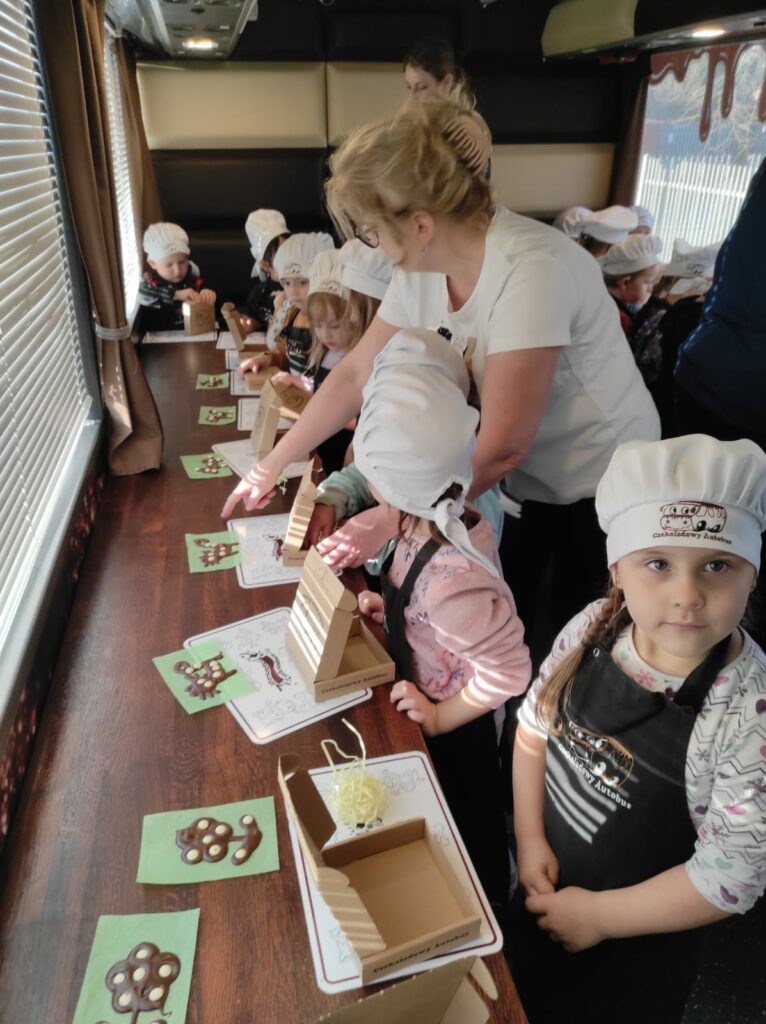 19 listopada 2025 r. do naszego przedszkola zawitał Czekoladowy Autobus, który objeżdżając różne zakątki Polski na chwilę zatrzymał się również przy Przedszkolu Samorządowym w Łomiankach. Dzieci mogły uczestniczyć w ciekawych warsztatach. Przedszkolaki dostały specjalne fartuszki oraz czapeczki „czekoladowych mistrzów” i mogły przystąpić do poznawania tego słodkiego świata. Najpierw poznały historię powstania czekolady oraz dowiedziały się, że ich ulubiony przysmak powstaje z drzewa kakaowca, którego owoc mogły obejrzeć. Nie obyło się również bez degustacji. Dzieci spróbowały różnych rodzajów czekolady, zarówno w formie płynnej jak i stałej. Mogły również własnoręcznie stworzyć wymarzoną tabliczkę czekolady według własnego pomysłu. Swoją czekoladową pracę zabrały do domu w pięknym zapakowanym pudełeczku. Na koniec, każdy mały uczestnik otrzymał dyplom mistrza czekolady.