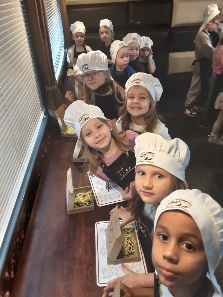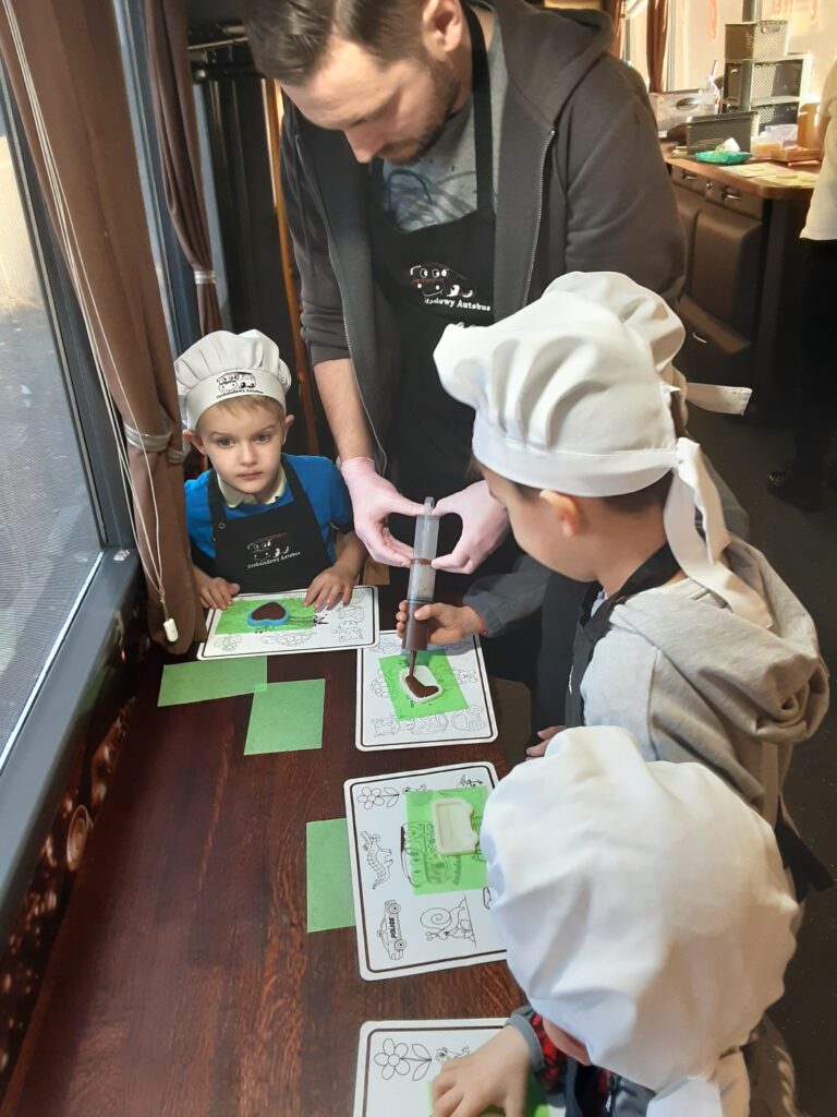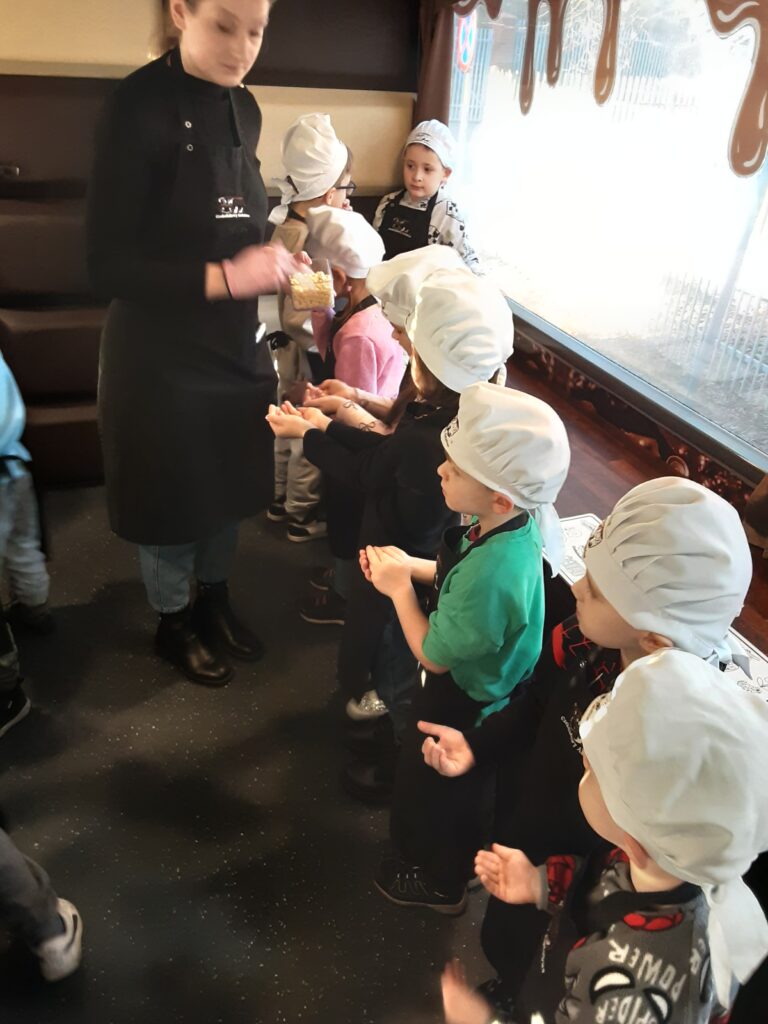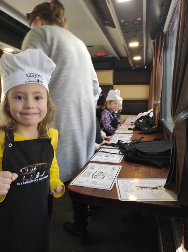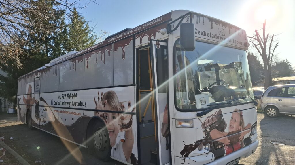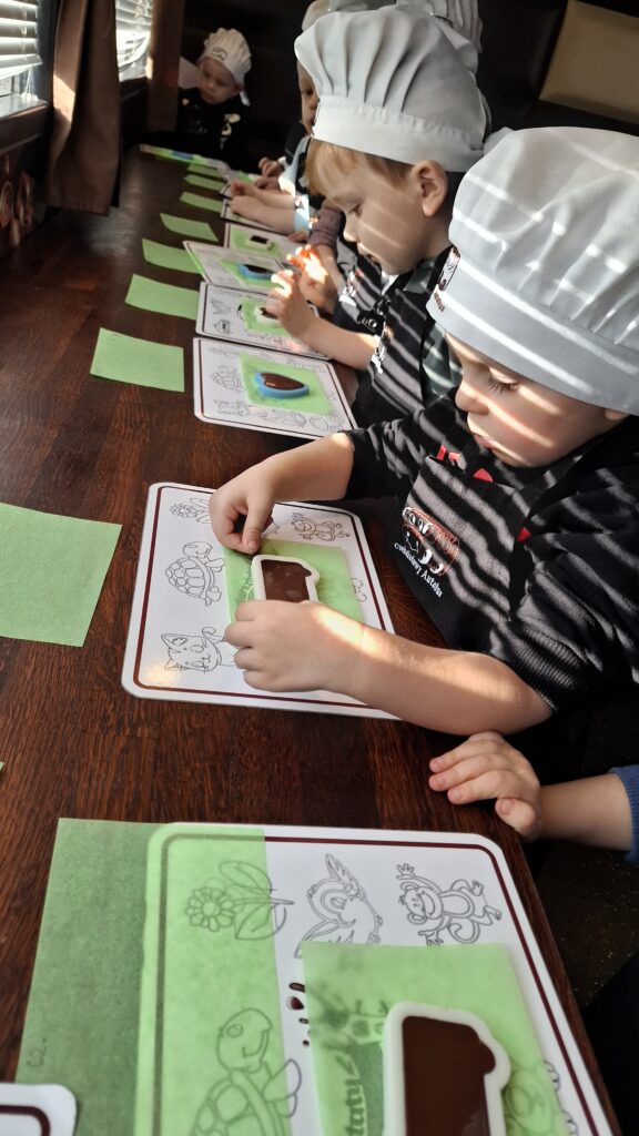 19 listopada 2025 r. do naszego przedszkola zawitał Czekoladowy Autobus, który objeżdżając różne zakątki Polski na chwilę zatrzymał się również przy Przedszkolu Samorządowym w Łomiankach. Dzieci mogły uczestniczyć w ciekawych warsztatach. Przedszkolaki dostały specjalne fartuszki oraz czapeczki „czekoladowych mistrzów” i mogły przystąpić do poznawania tego słodkiego świata. Najpierw poznały historię powstania czekolady oraz dowiedziały się, że ich ulubiony przysmak powstaje z drzewa kakaowca, którego owoc mogły obejrzeć. Nie obyło się również bez degustacji. Dzieci spróbowały różnych rodzajów czekolady, zarówno w formie płynnej jak i stałej. Mogły również własnoręcznie stworzyć wymarzoną tabliczkę czekolady według własnego pomysłu. Swoją czekoladową pracę zabrały do domu w pięknym zapakowanym pudełeczku. Na koniec, każdy mały uczestnik otrzymał dyplom mistrza czekolady.