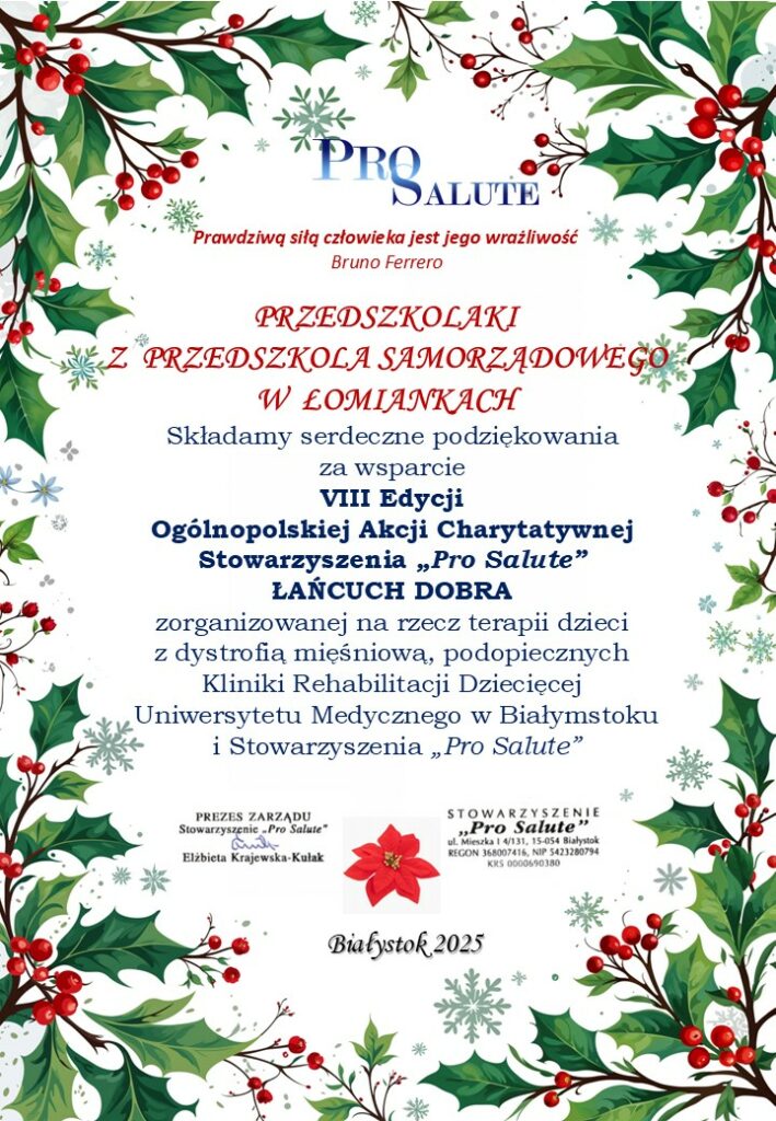 Dzieci z naszego przedszkola wzięły udział w VIII Edycji Ogólnopolskiej Akcji Charytatywnej „ŁAŃCUCH DOBRA” ,,Organizatorem’’ jest Stowarzyszenie „Pro Salute” z siedzibą w Białymstoku.